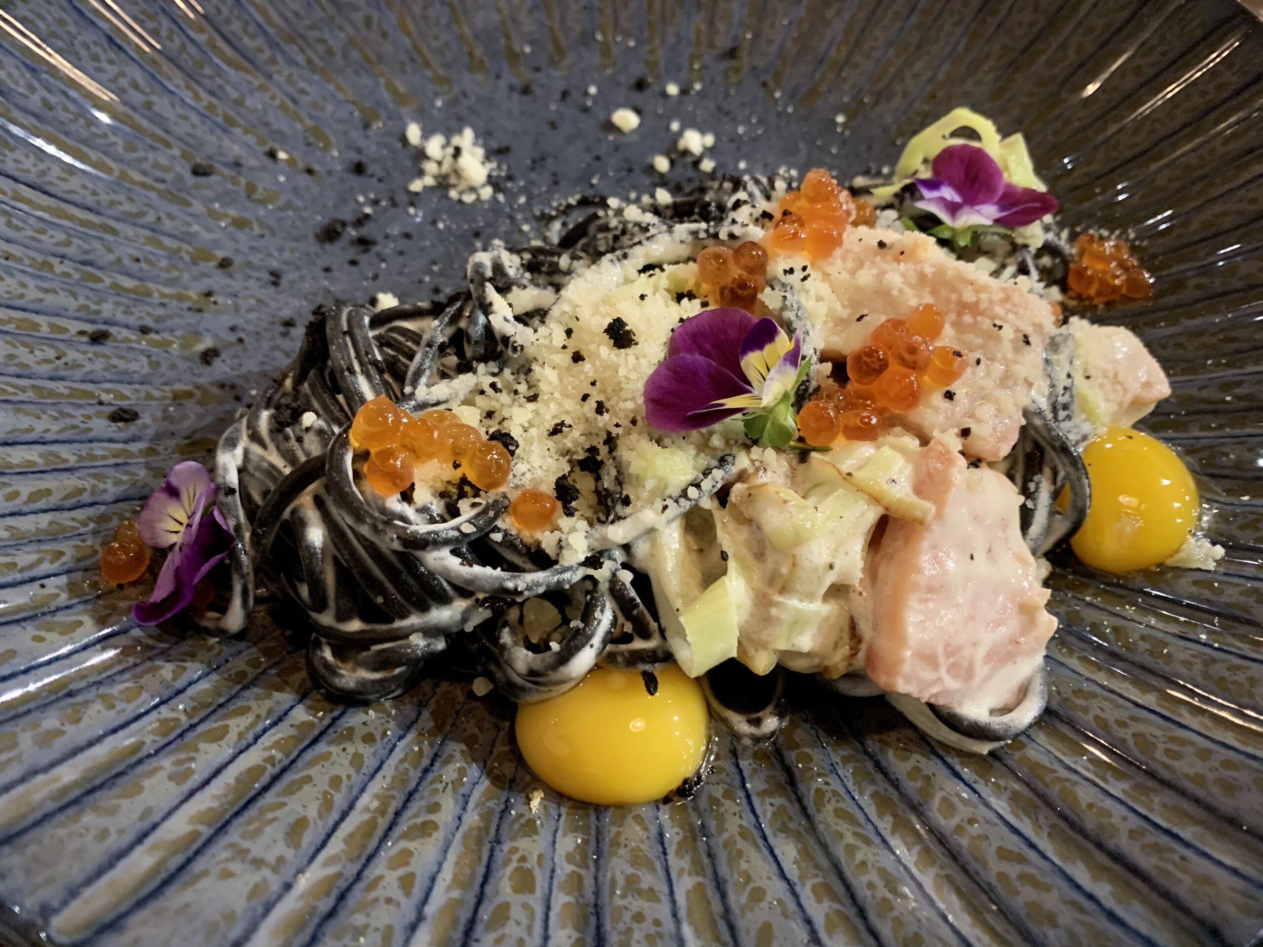 เส้นดำซอสครีม มีปลาแซลม่อน ไข่ปลา และไข่นกกระทา แต่งด้วยดอกไม้ จานสวย รสชาติดี