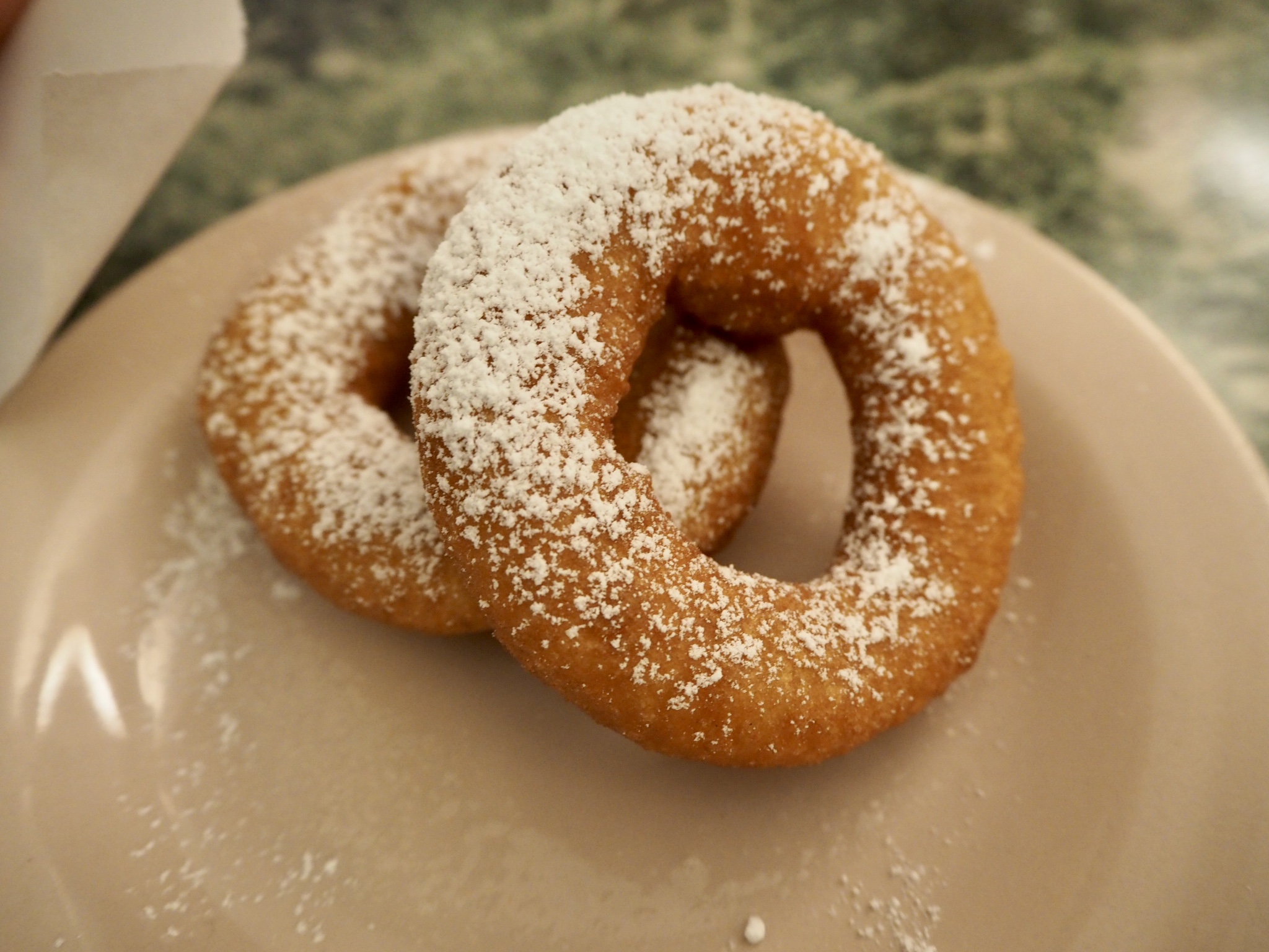 คำแรกกัดปุ๊บ “โอ้วโหย ดีอ่า ไม่หวานไป ไม่อมน้ำมัน” คล้ายปาท่องโก๋ผสมพอนเดอริง โรยไอซิ่งพอดี เป็นโดนัทวงกลมทอดสดๆ ร้อนๆ เนื้อนุ่มฟู โรยด้วยไอซิ่งขาวโพลน แนะนำว่าต้องสั่งอย่างน้อย 3-4 ชิ้นถึงจะฟินแต่เรากินอย่างอื่นมาก่อนหน้านี้แล้ว จึงลองแค่ชิ้นเดียว