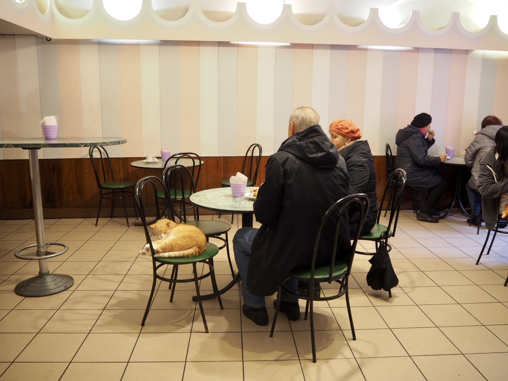 บรรยากาศร้านมีคนทุกวัย เด็กเล็กกับแม่ คนเฒ่า คนหนุ่มสาว ร้านไม่ใหญ่แต่คนเข้าออกต่อเนื่อง โต๊ะมีแผ่นกระดาษเล็กให้จับโดนัทไม่เปื้อนมืออยู่แทบทุกโต๊ะเลยจริง ๆ ค่ะ ในร้านมักจะมีแมวส้มตัวอ้วนชื่อ Ryzhik คอยต้อนรับลูกค้า เป็นมาสคอตประจำร้านที่ทุกคนเอ็นดู ซึ่งเราก็เจอแมวส้มด้วยจริง ๆ