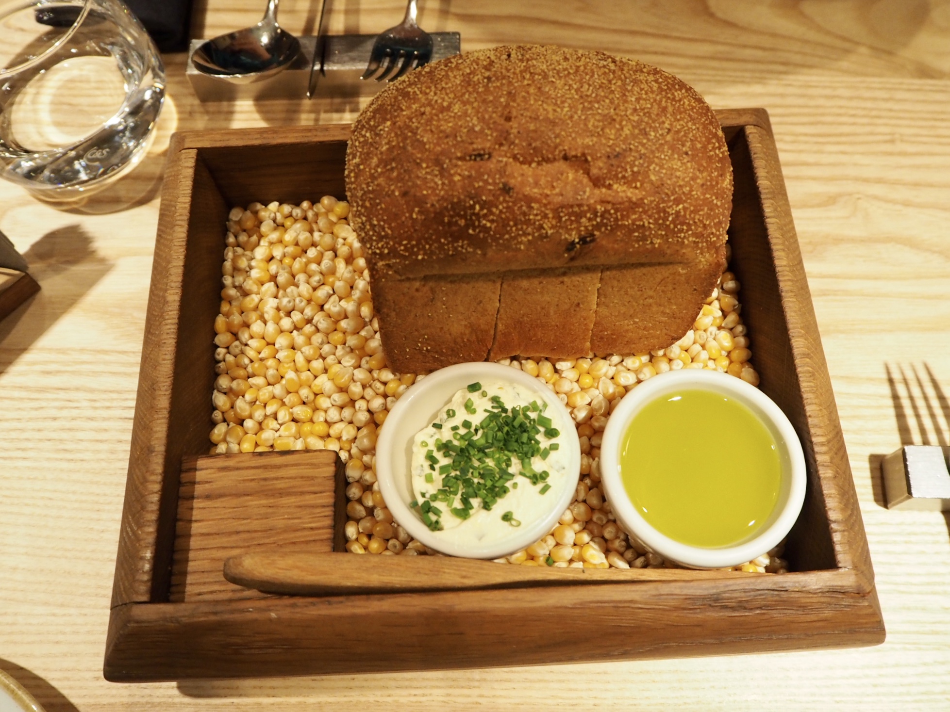 กรอบนอก นุ่มใน หอมข้าวโพด มีน้ำมันมะกอกมาให้จิ้มด้วย แต่กินขนมปังเปล่าๆ อร่อยสุด ข้าวโพดเม็ดที่โรยมาข้างล่างแข็งมาก ไม่แนะนำให้กิน -