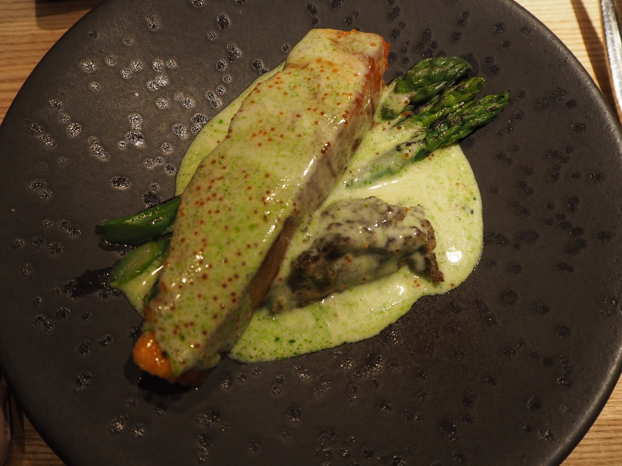 เนื้อแซลม่อนย่างกับข้าวบาเล่ย์กับซอสอมเปรี้ยว ผักเคียงเป็นหน่อไม้ฝรั่ง เป็นเมนูที่เน้นสุขภาพและมีความซับซ้อนของเนื้อสัมผัส (Texture) ที่ดี ความมันของปลาแซลมอนจะถูกตัดด้วยความเปรี้ยวสดชื่นจากซอสส้ม และมีความหนึบหนับจากข้าวบาร์เลย์คั่ว จานนี้ดีไม่แพ้เพื่อนเลย