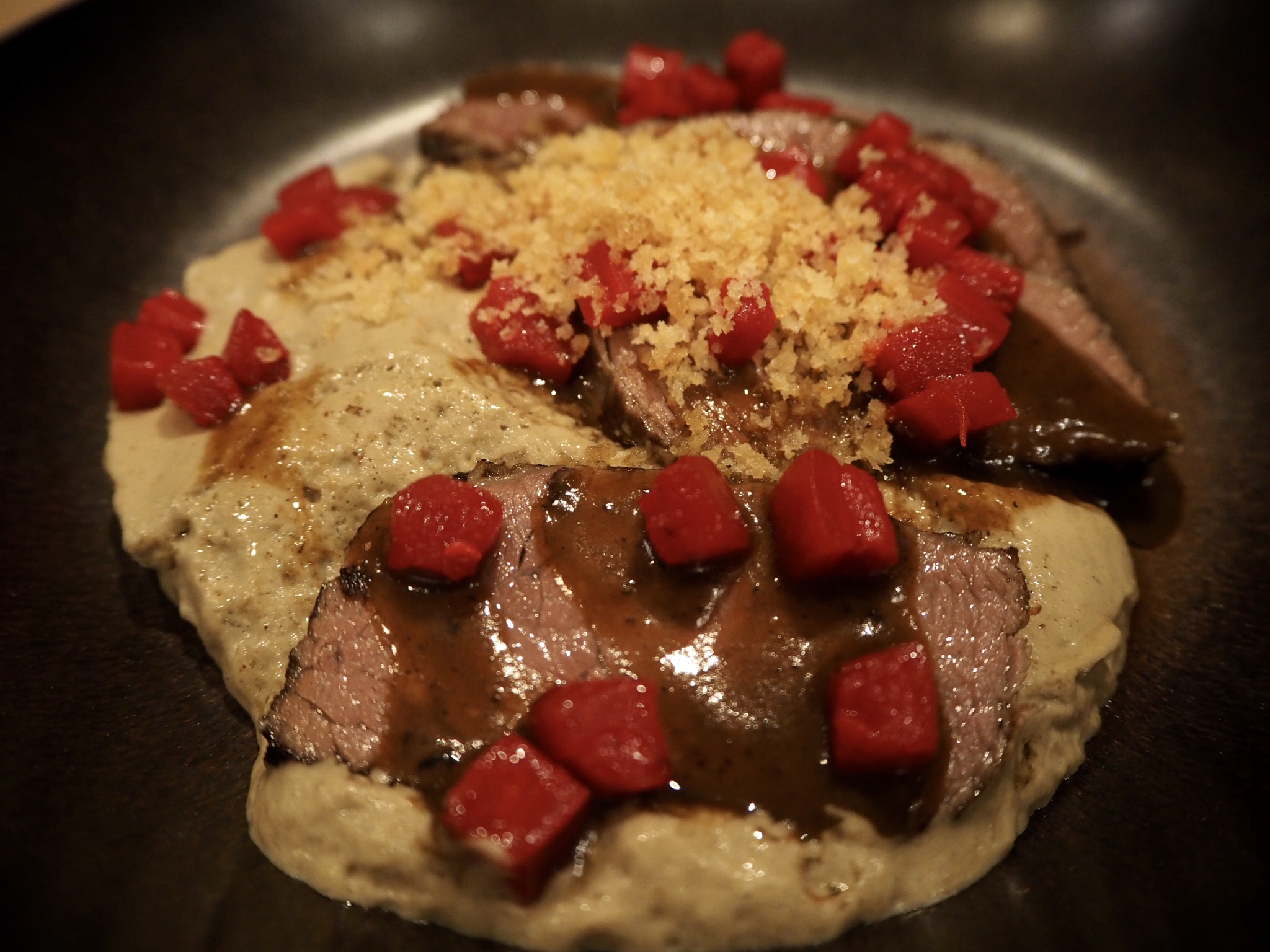 เนื้อวัวนุ่มเหมือนลิ้น ซอสกลมกล่อม บีทรูทเปรี้ยวหั่นเต๋าตัดรส เป็นเนื้อส่วน เสือร้องไห้/เนื้อส่วนอกและมะเขือยาว) เนื้อ Brisket ที่ผ่านการเคี่ยวจนเปื่อยจะมีความนุ่มหนึบ เข้ากันได้ดีกับมะเขือยาวที่ดูดซับน้ำซุปจนฉ่ำอร่อยน้ำตาแทบไหล มันจะดูดซับไขมันและรสชาติจากเนื้อ Brisket ไว้ทั้งหมด ทำให้มะเขือยาวในจานนี้อาจจะอร่อยกว่าเนื้ออีก มะเขือยาวเมื่อสุกแล้วจะมีความเป็นครีม (Creamy) การทานคู่กัน ใครจะไปคิดว่ามันเข้ากันไปหมด สั่งเถิดนะถ้าไปลอง!