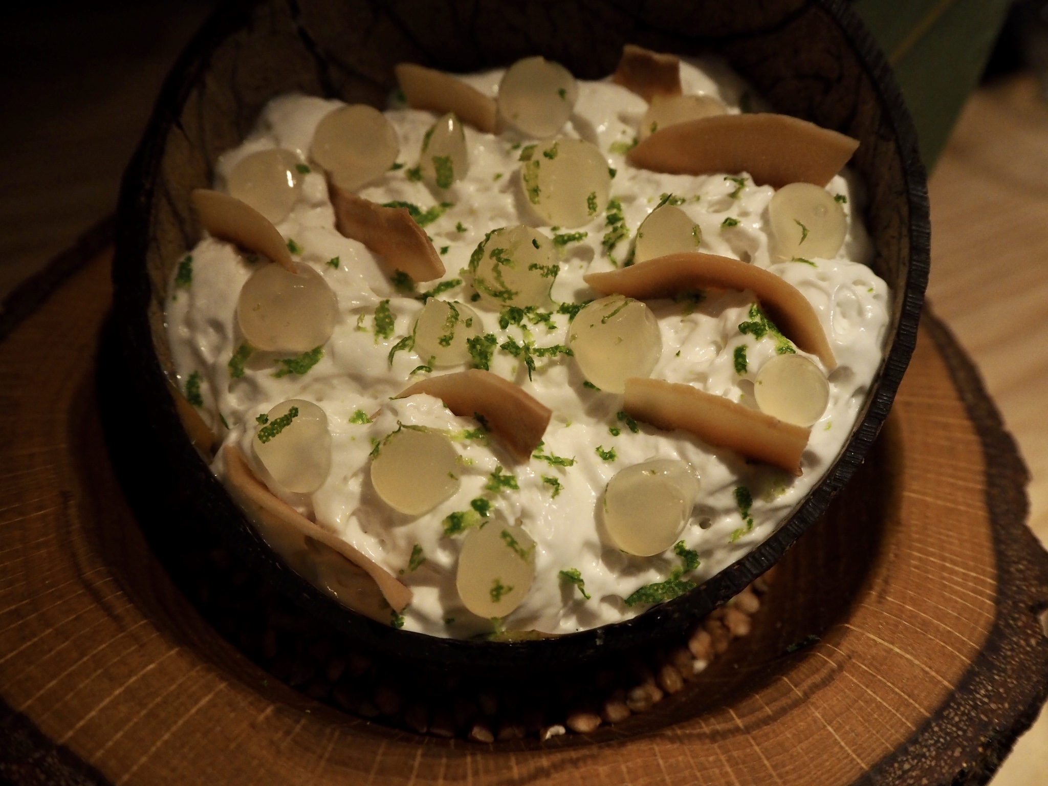 เมนูนี้คือการผสมผสานรสชาติแบบ Tropical (เขตร้อน) ที่สดชื่นมากๆ เป็นการนำวัตถุดิบไทยมาทำให้ดูหรูหราและมีมิติมากขึ้น โดยเฉพาะการใช้ ใบมะกรูด (Kaffir lime) มาดึงกลิ่นให้โดดเด่น จานนี้ให้ความคิดสร้างสรรค์ 10/10 -