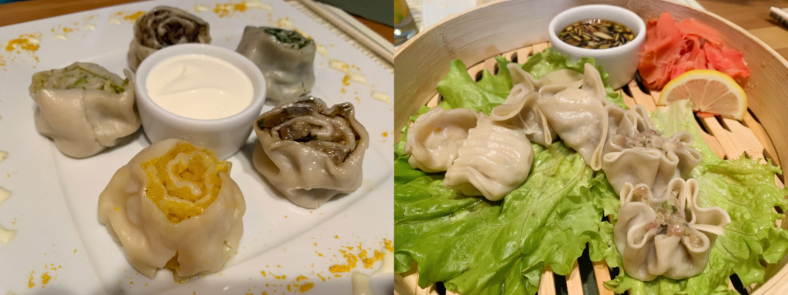 เกี๊ยวห่อไส้ต่าง ๆ 5 ชิ้น: ฟักทอง, เห็ด, ผักโขม, บลอคโคลี่, มะเขือม่วง จิ้มซอส Sour Cream หรือสั่งซุปทานคู่ อร่อยทุกไส้ ชอบฟักทองที่สุด -